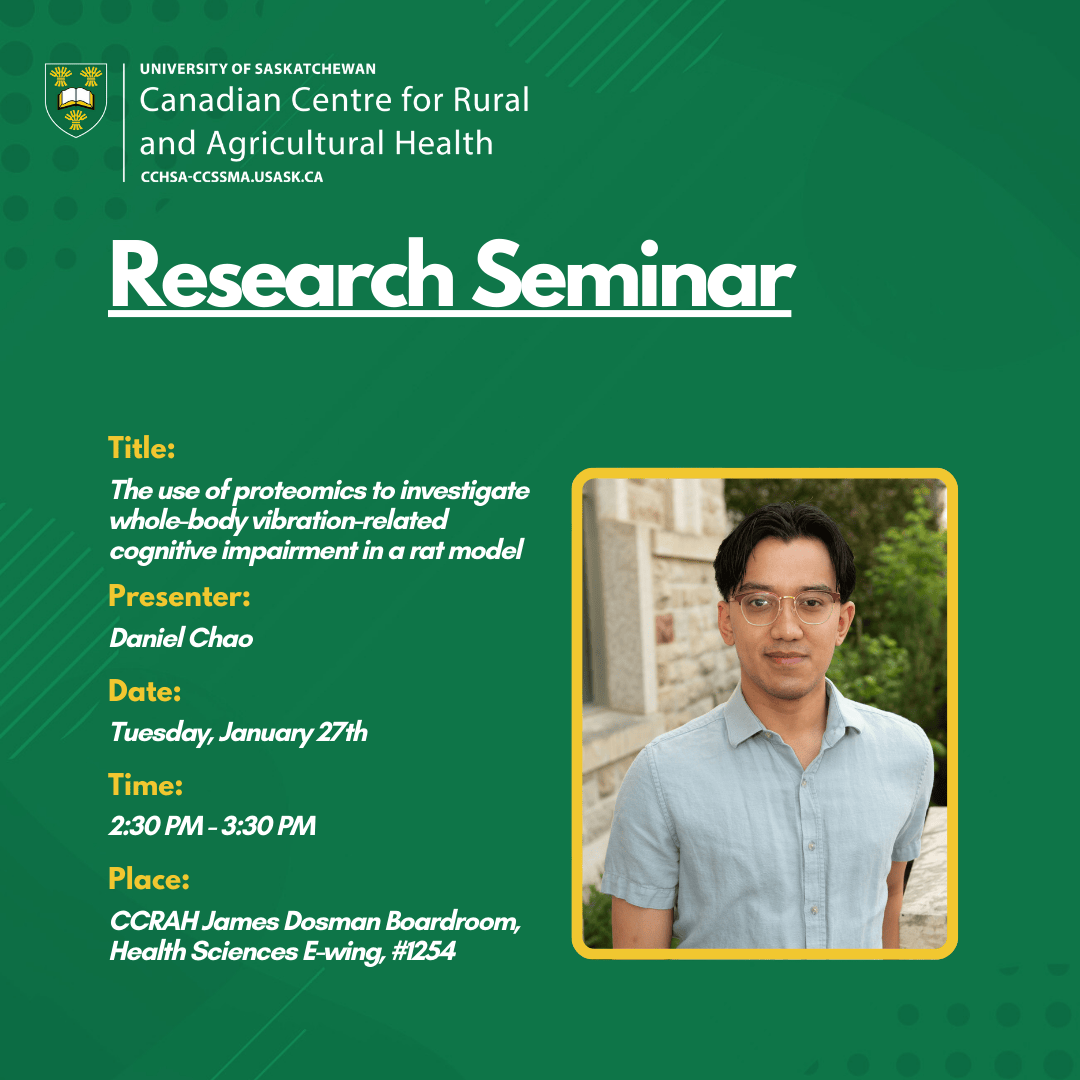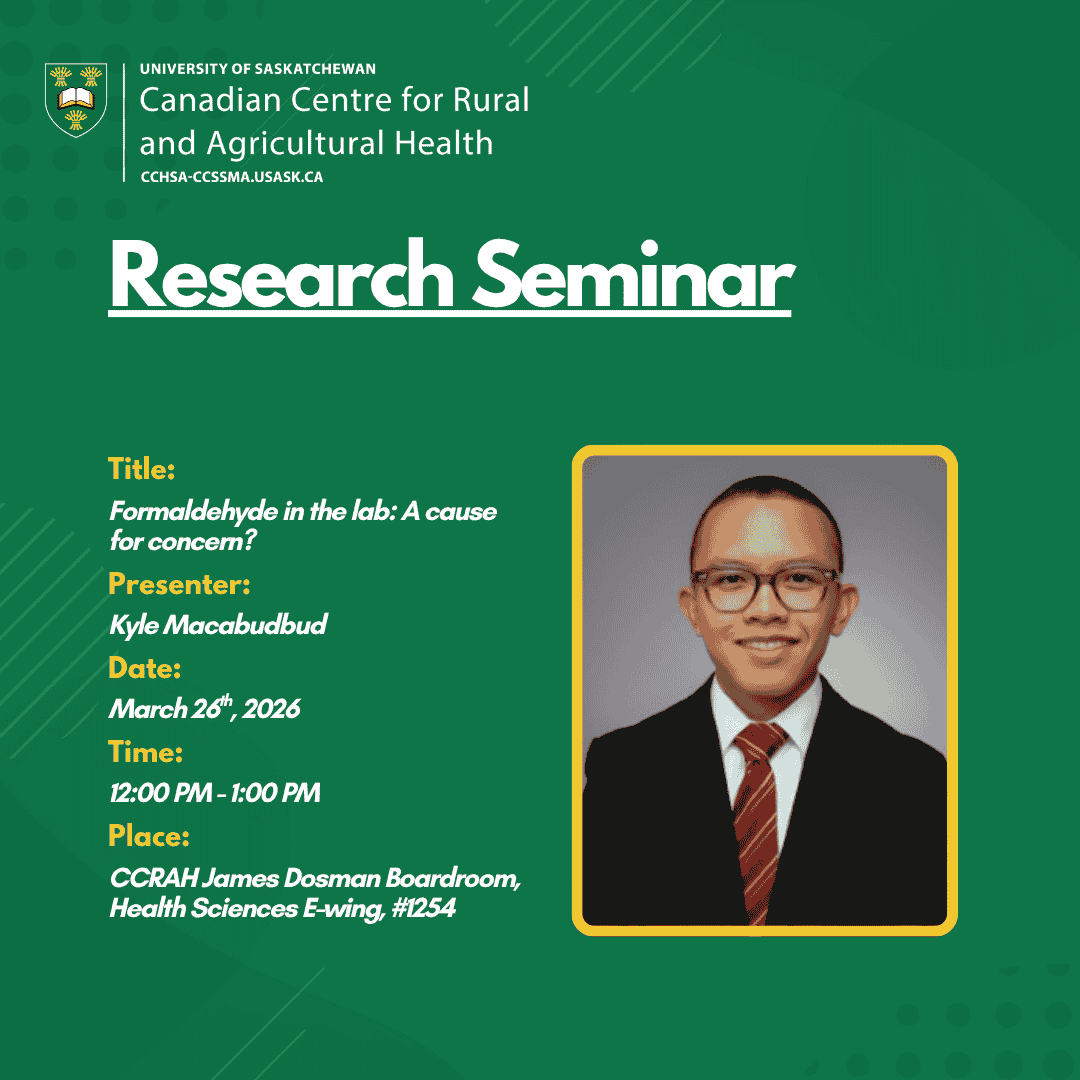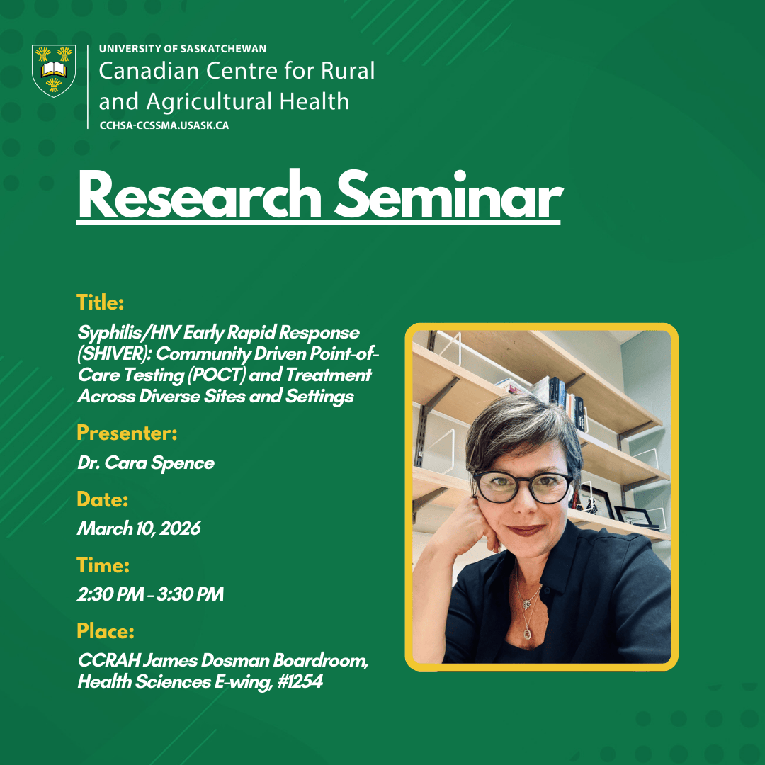 The Canadian Centre for Rural and Agricultural Health seminar is a biweekly lecture delivered by invited speakers on Tuesdays from 2:30-3:30 during the school term. Presentations are offered in-person and by Zoom.