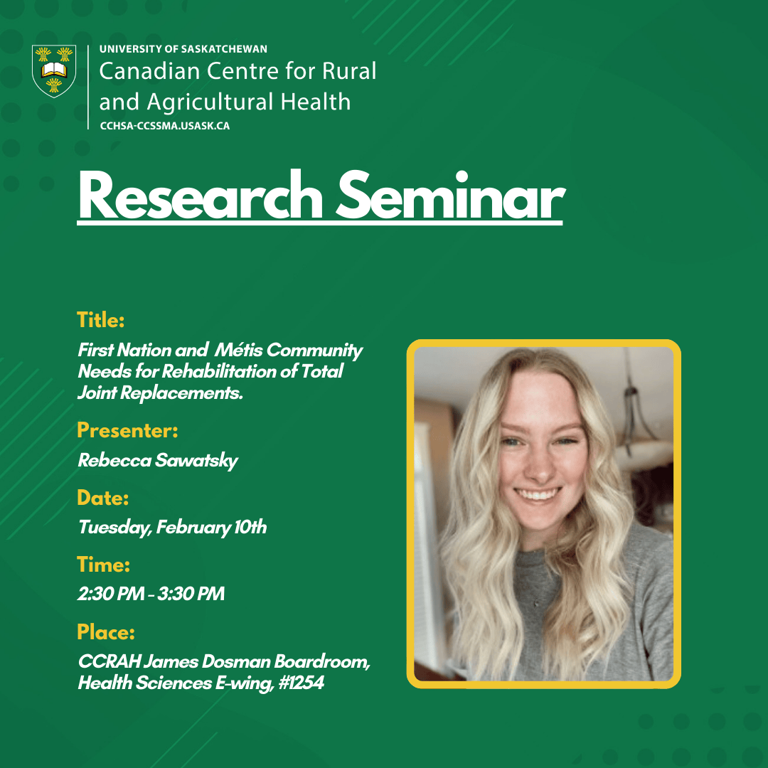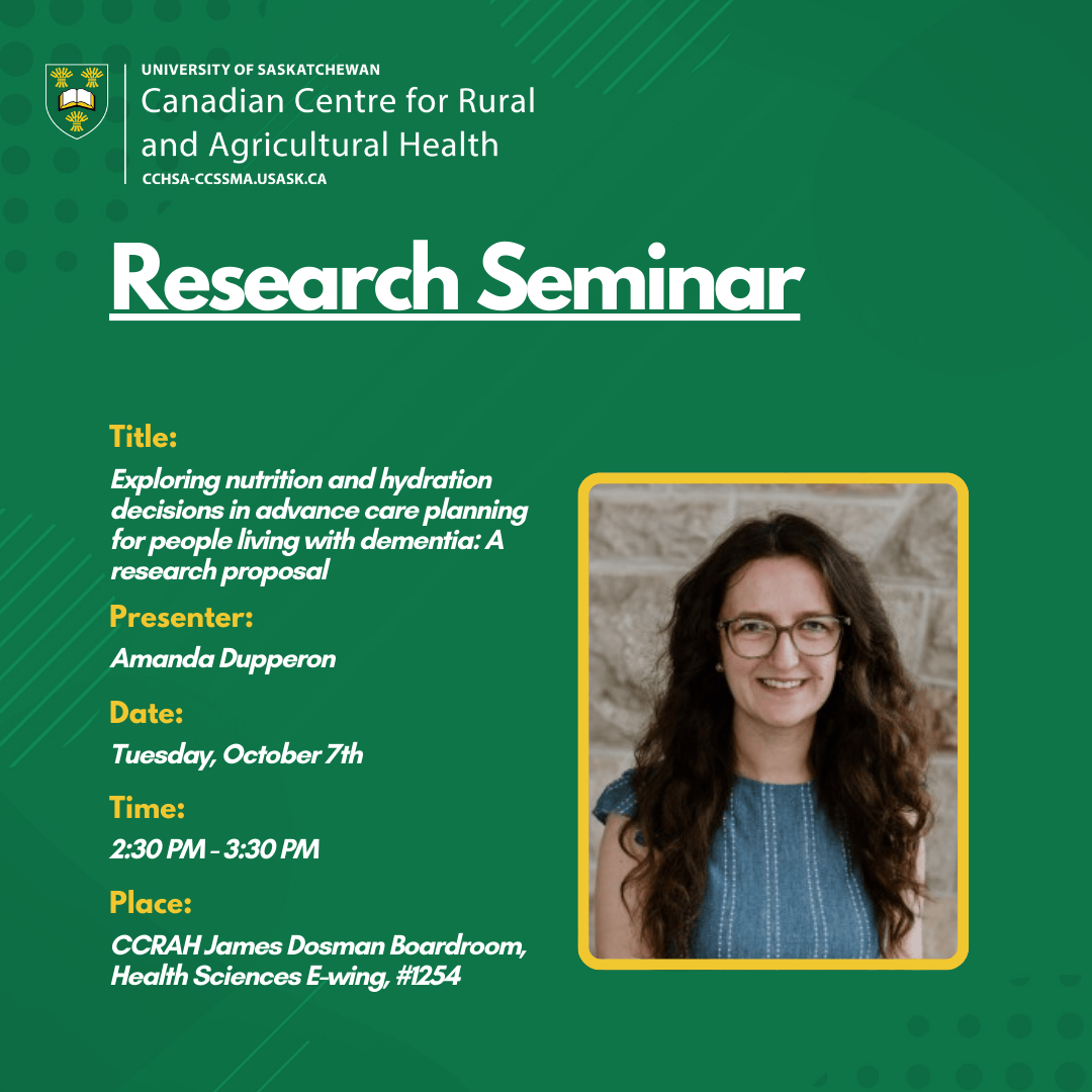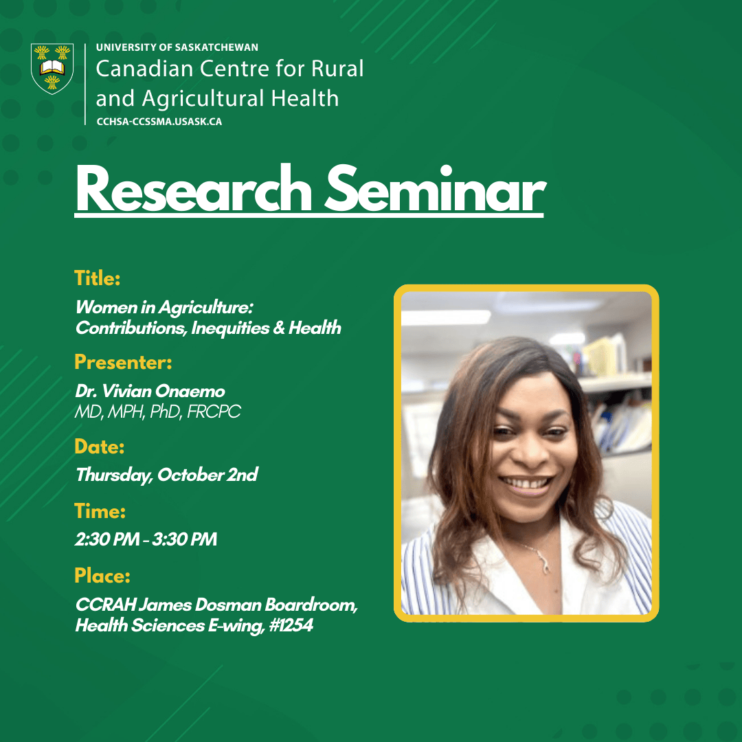 The Canadian Centre for Rural and Agricultural Health seminar is a biweekly lecture delivered by invited speakers on Tuesdays from 2:30-3:30 during the school term. Presentations are offered in-person and by Zoom.
